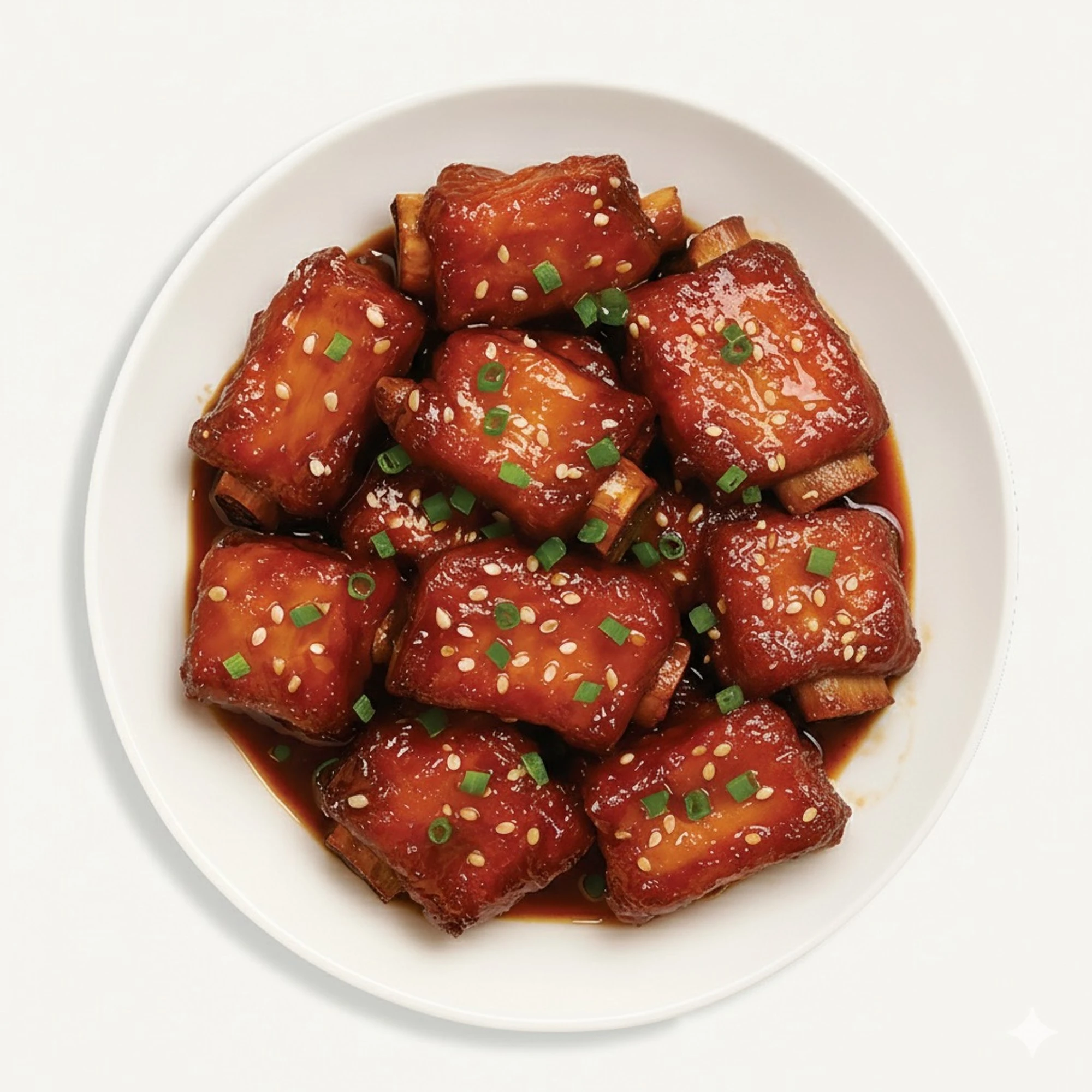 Zart geschmorte Schweinerippchen nach klassischer Hong-Shao-Art, in seidiger Soja-Karamellglasur, verfeinert mit Sesam und frischer Frühlingszwiebel.