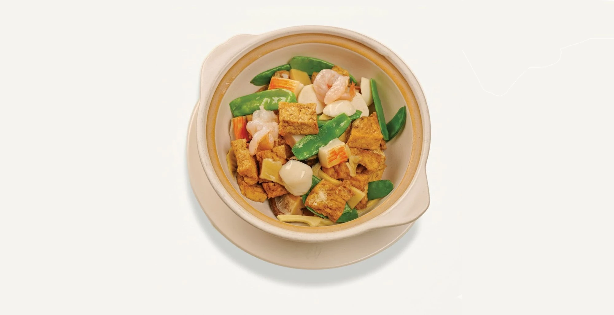Zart gebratener Tofu schmort mit Garnelen, Fischbällchen und zartem Surimi in einer klaren, umami-reichen Brühe mit frischen Gemüse.